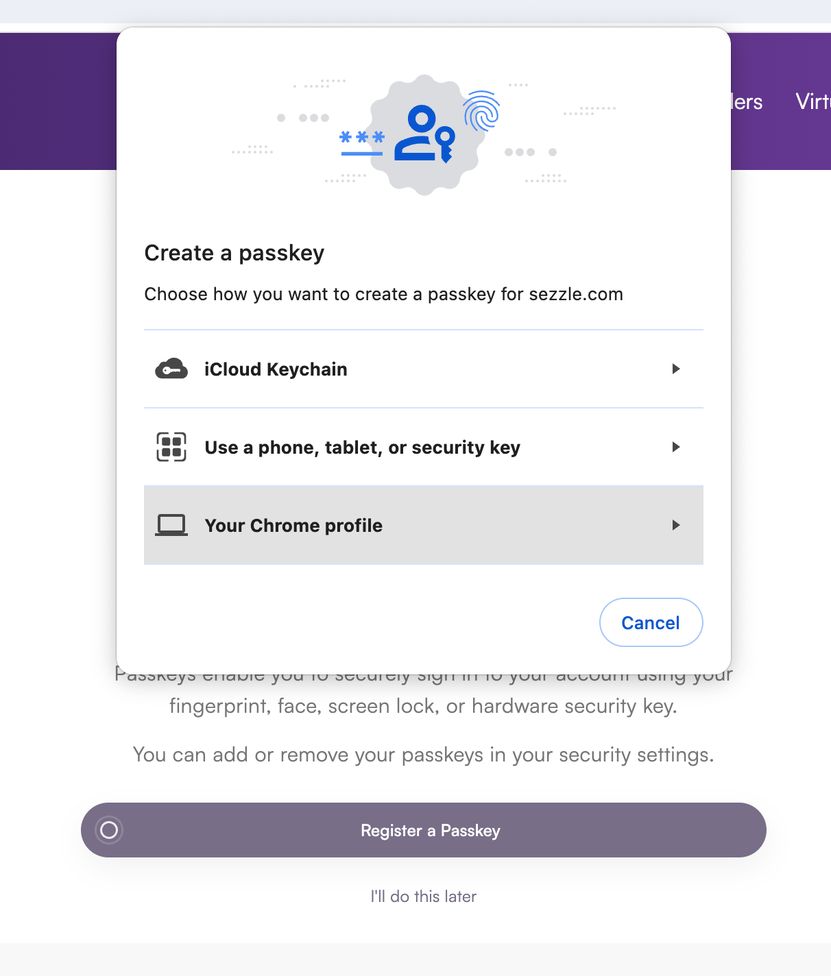 Create a passkey using our iCloud Keychain, another device via a QR code, or your Chrome profile.