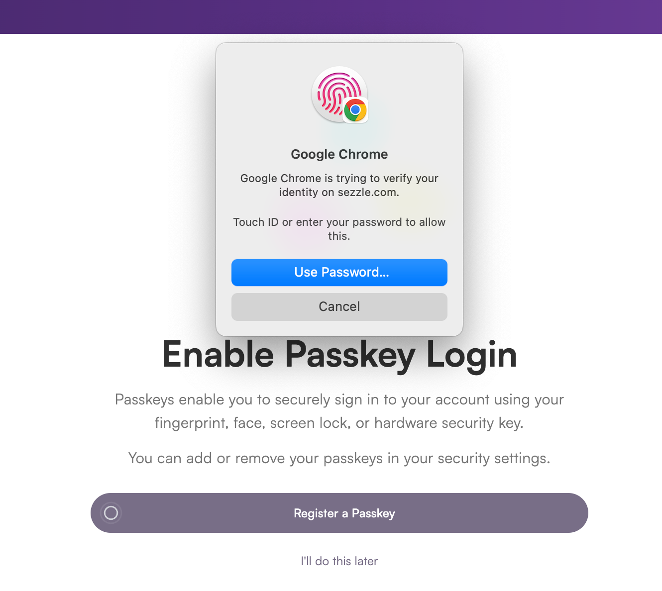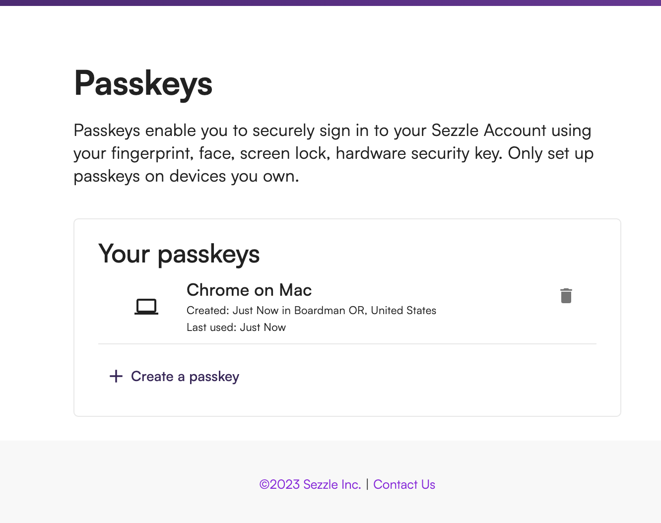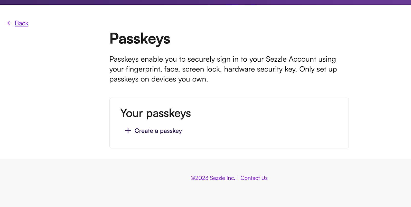 La connexion par clé d'accès est un moyen sûr et pratique d'accéder à votre compte sans avoir besoin d'un mot de passe traditionnel. Au lieu de devoir mémoriser un mot de passe complexe, vous utilisez une clé d'accès unique – qui peut être une connexion via Face ID ou empreinte digitale – pour vous authentifier et accéder à votre compte. Vous pouvez ajouter plusieurs clés d'accès à votre compte Sezzle afin de vous connecter en toute simplicité depuis votre appareil mobile ou votre ordinateur de bureau.